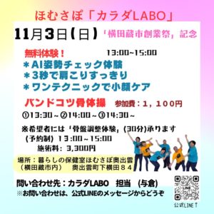 11月3日(日)ほむさぽ「カラダLABO」 「横田蔵市創業祭」に出店いたします。
