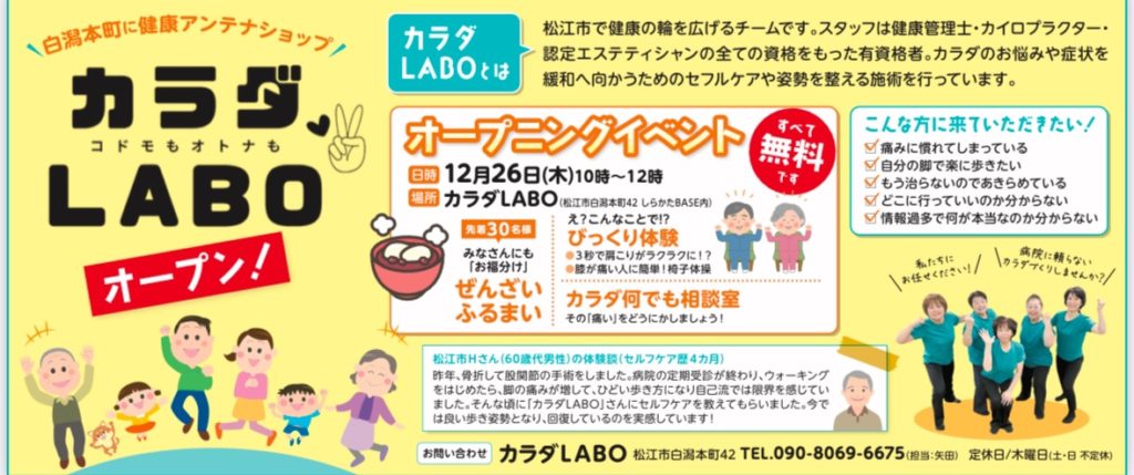 全て無料で健康相談や家でもできる椅子の体操、ぜんざいの振る舞いもありますのでぜひ、オープンにお越しくださいませ。