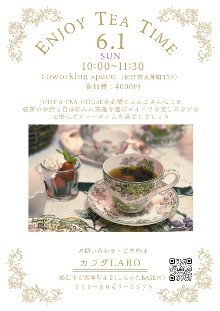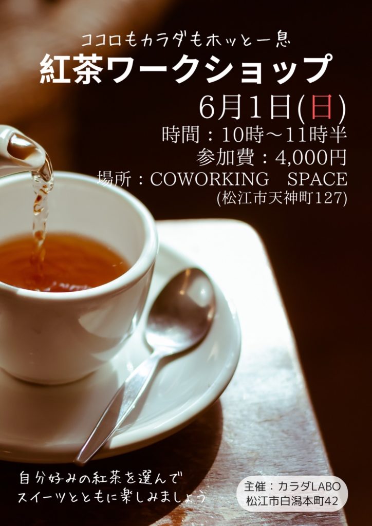 紅茶ワークショップ coworking space松江天神(コワーキングスペース) カラダLABO しらかたBASE 2025年5月2日 最終更新日時 : 2025年5月2日 kenkounootaku ココロもカラダもホッと一息してみませんか?