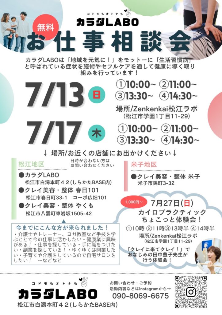 お仕事相談会 カラダLABO しらかたBASE 2025年6月18日 最終更新日時 : 2025年6月18日 kenkounootaku お近くの店舗にお出かけください! 担当スタッフがお待ちしております!