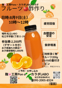 8月9日 松江LABOにて 麹工房Pono様とカラダLABOによるコラボイベントを開催いたします。 健康にご興味のある方やフルーツ酢作りにご興味のある方、お待ちしております。
